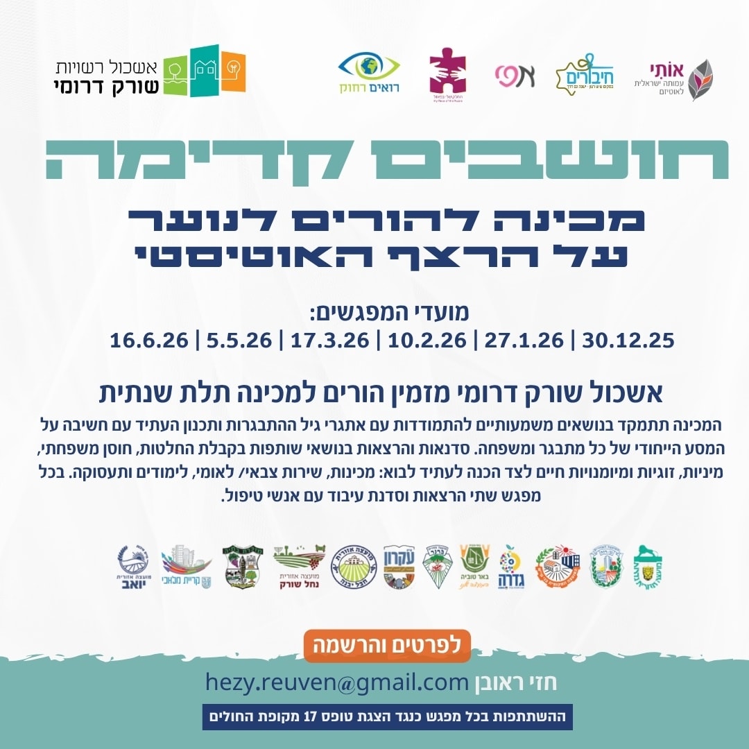 הורים לנוער על הרצף האוטיסטי? אשכול שורק דרומי שמח להזמין אתכם להצטרף למכינה ייעודית להורים לנערים בכיתות י'-י"ב, שתתמקד באתגרים הייחודיים של מתבגרים על הרצף האוטיסטי ושל המעבר לעצמאות. בואו לקבל כלים וידע, לפגוש עוד הורים כמוכם וליהנות! התוכנית בשיתוף העמותות "אותי", "חיבורים", "אפי", "רואים רחוק" ו"החלק שלי בפאזל". לפרטים נוספים והרשמה לחצו כאן >> […]