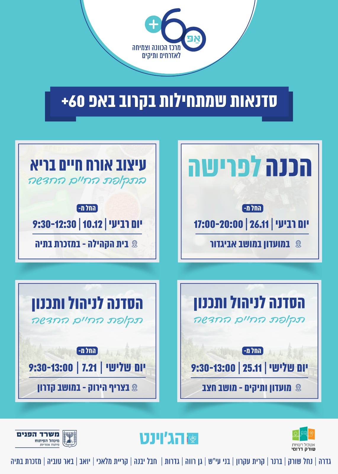 מוזמנים ומוזמנות להצטרף לאחת מ-4 סדנאות שייפתחו בקרוב במרכז אפ 60+ אשכול שורק דרומי עובדים ופורשים בשנתיים הקרובות? מוזמנים להירשם לסדנת הכנה לפרישה לרישום: לתשלום: מתעניינים בבריאות ואיכות חיים? הפרעות שינה, מוח וניהול זמן? בואו לסדנה לאורח חיים בריא לרישום לתשלום: פרשתם במהלך ה-5 שנים האחרונות? בואו לחשב מסלול מחדש ולבנות את תקופת החיים החדשה […]