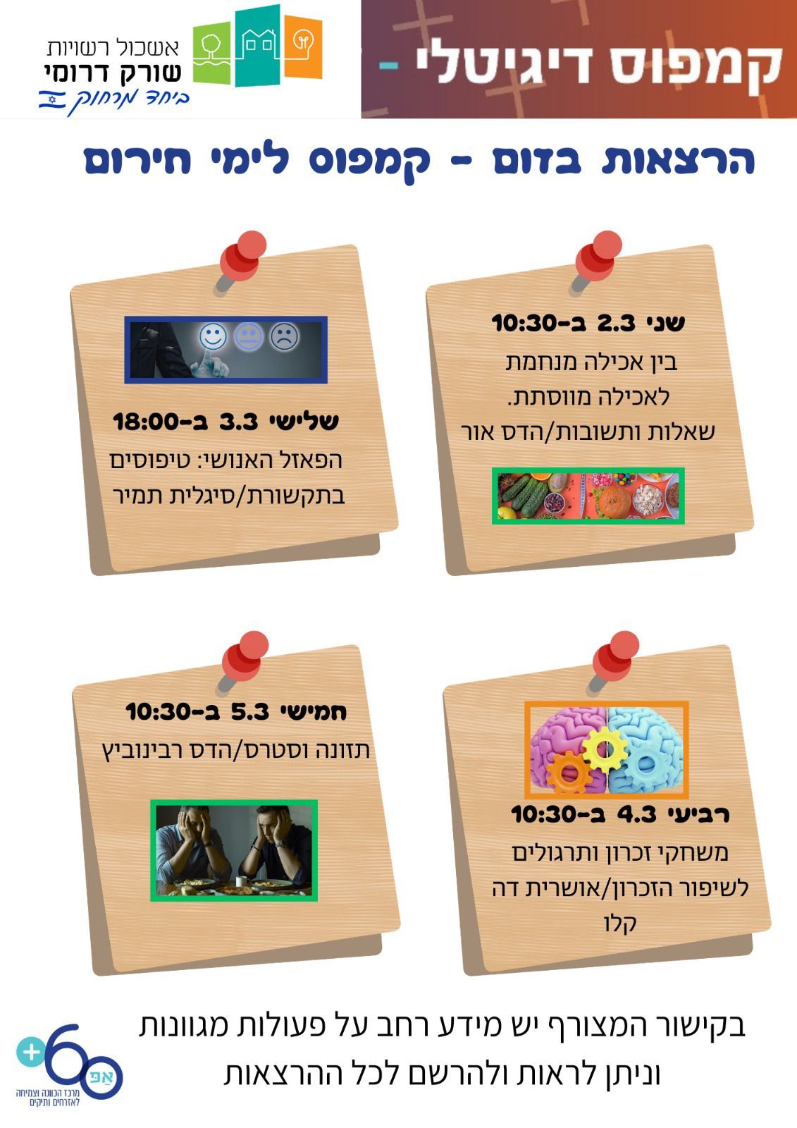 אשכול שורק דרומי איתכם – גם בבית בימים אלו, כשאנחנו נדרשים למצוא כוחות ורגעים של הפוגה בתוך המציאות המורכבת, אשכול שורק דרומי ומרכזי "אפ +60" כאן בשבילכם. פלטפורמת "שישים ומשהו" – הבית הדיגיטלי שלכם לכל מה שחשוב, עודכנה עבורכם ברוח הימים הללו. מה מחכה לכם? הרצאות יומיות: בכל יום הרצאה חדשה ומעשירה של מרכז "אפ […]