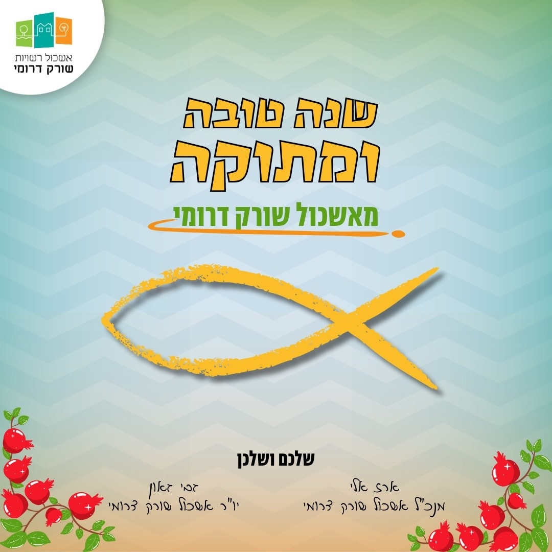 שנה טובה ומתוקה! אשכול רשויות שורק דרומי מאחל לתושבות ולתושבי רשויות האשכול ולכל עם ישראל שנה טובה – שנה של בריאות, עשייה, שותפות, חדשנות ושגשוג. נמשיך לצעוד קדימה, לפתח ולהעצים – ביחד. בתקווה גדולה לשובם של החטופים לביתם, לחזרתם בשלום של חיילי צה"ל ולרפואתם של הפצועים בגוף ובנפש. שלכם ושלכן, אשכול שורק דרומי